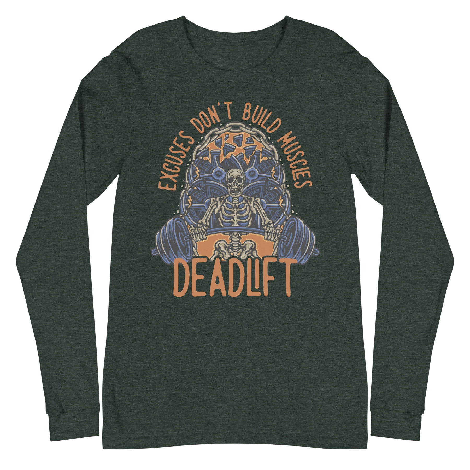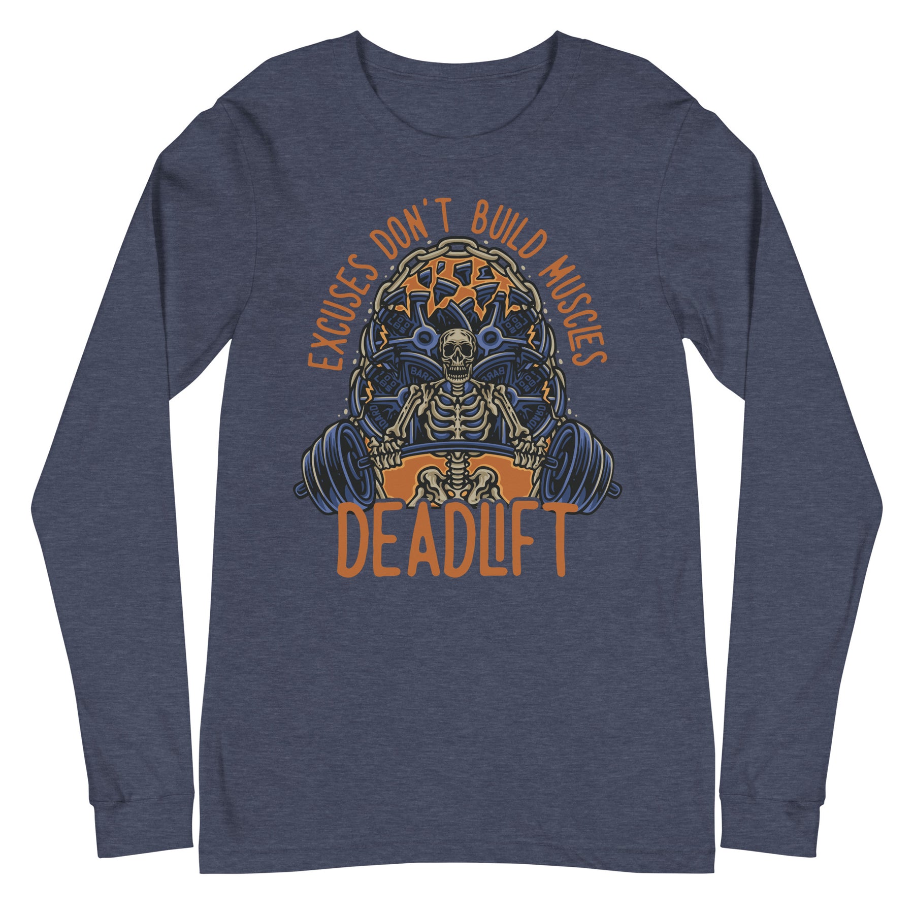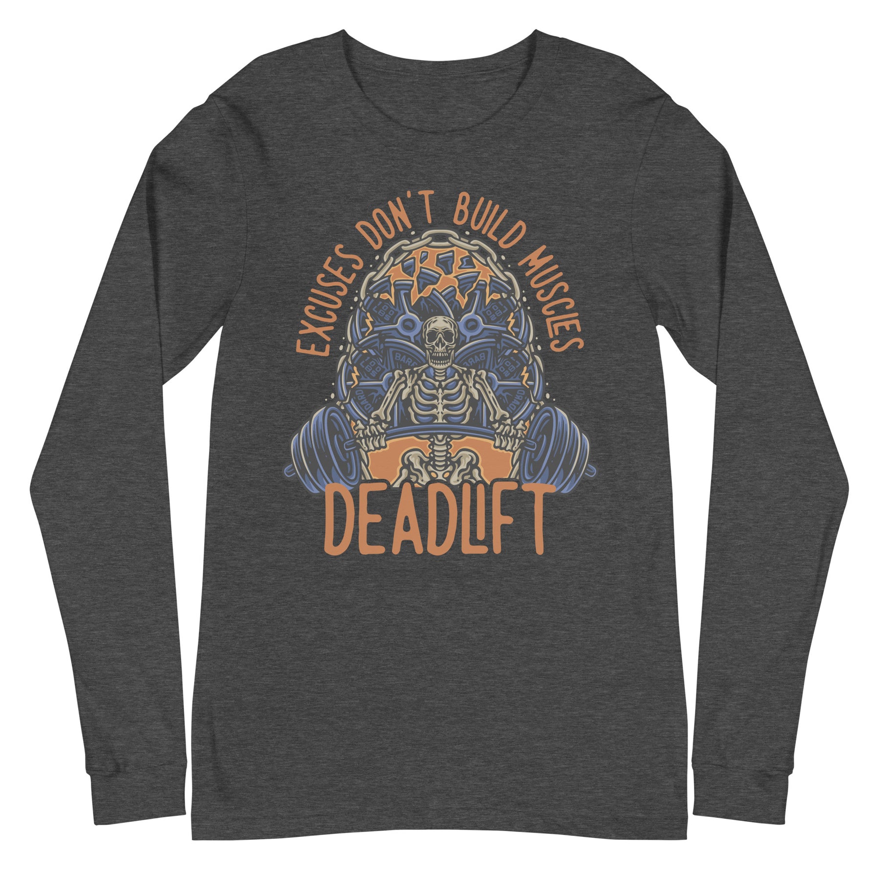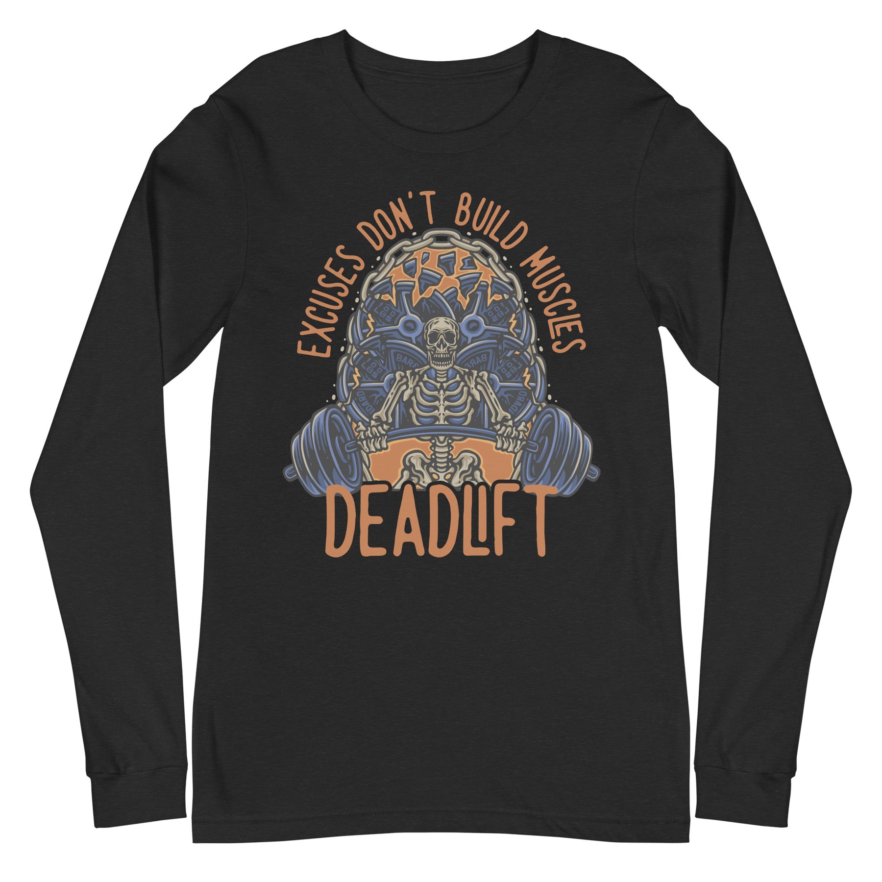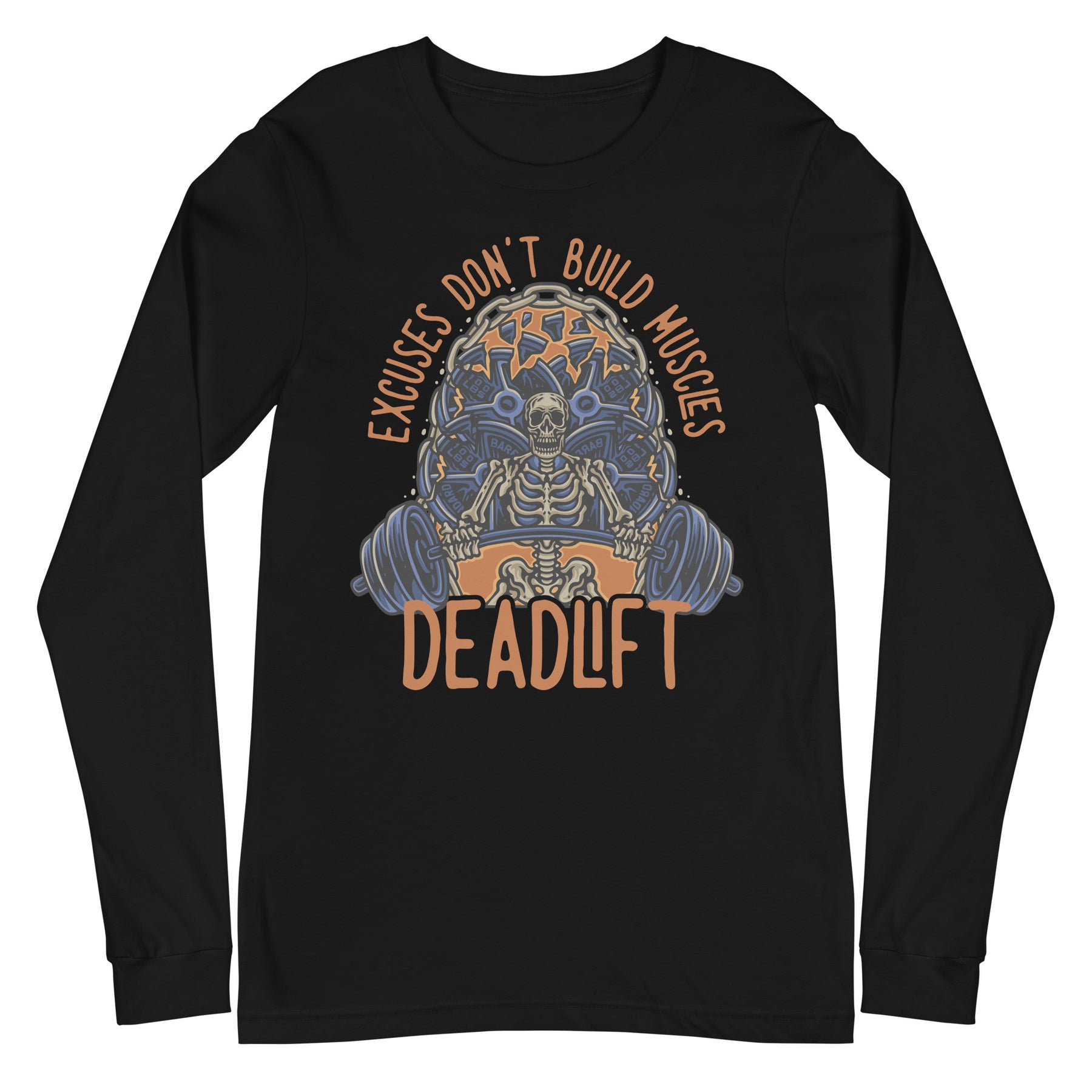 Cold mornings in the garage gym are where champions are forged. This premium long sleeve tee is built for the heavy hitters who don’t let a drop in temperature drop their intensity. Featuring the iconic skeletal powerhouse locked into a heavy pull, this shirt offers the extra coverage you need while maintaining the raw, gritty aesthetic of the platform. With stacked plates and broken chains framing the design, it’s a constant reminder that while others make excuses, you make progress.